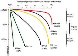 Par ailleurs, l'eau absorbe très fortement certaines radiations. L'infrarouge disparaît pratiquement à 1 m, le rouge à 5 m, l'orange à 10 m, le jaune à 20 m, le vert à 30 m. L'ultraviolet est lui aussi très fortement absorbé. Au-dessous de 10 m, il ne reste pratiquement qu'une lumière bleue qui s'atténue progressivement avec la profondeur. Cette lumière est relativement favorable si l'on expose du film noir et blanc, mais il n'en va évidemment pas de même en couleurs avec la disparition des teintes chaudes qui ne peuvent plus être perçues. L'éclairement change finalement très vite non seulement en qualité, mais aussi en quantité, même dans une eau parfaitement limpide. Dans les meilleures conditions, si l'on peut photographier à f/16 juste sous la surface, on passe à f/8 à 1 m de profondeur, à f/5,6 à 5 m, à f/4 à 10 m et à f/2,8 à 30 m, toutes choses égales par ailleurs.