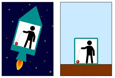 Selon la relativité générale le référentiel du sol n'est pas inertiel, parce qu'il n'est pas en chute libre. Il est équivalent au référentiel d'une fusée qui accélère :