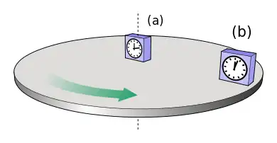 Si b est une horloge est à la périphérie d'un disque en rotation d'un disque en rotation, elle est ralentie par rapport à une horloge a qui reste au centre :