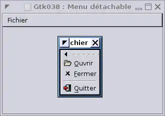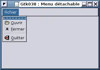 Pour détacher le menu dans lequel se trouve l'élément GtkTearoffMenuItem, il suffit de cliquer sur celui-ci. Un second clic sur l'élément (que cela soit dans le menu ou dans la fenêtre) supprimera la fenêtre créée.