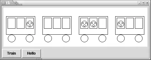 from Tkinter import * class FaceDom: def __init__(self, can, val, pos, taille =70): self.can =can # *** x, y, c = pos[0], pos[1], taille/2 can.create_rectangle(x -c, y-c, x+c, y+c, fill ='ivory', width =2) d = taille/3 # *** self.pList =[] # *** pDispo = [((0,0),), ((-d,d),(d,-d)), ((-d,-d), (0,0), (d,d))] disp = pDispo[val -1] # *** for p in disp: self.cercle(x +p[0], y +p[1], 5, 'red') def cercle(self, x, y, r, coul): # *** self.pList.append(self.can.create_oval(x-r, y-r, x+r, y+r, fill=coul)) def effacer(self): # *** for p in self.pList: self.can.delete(p) class Projet(Frame): def __init__(self, larg, haut): Frame.__init__(self) self.larg, self.haut = larg, haut self.can = Canvas(self, bg='dark green', width =larg, height =haut) self.can.pack(padx =5, pady =5) # *** bList = [("A", self.boutA), ("B", self.boutB), ("C", self.boutC), ("D", self.boutD), ("Quitter", self.boutQuit)] for b in bList: Button(self, text =b[0], command =b[1]).pack(side =LEFT) self.pack() def boutA(self): self.d3 = FaceDom(self.can, 3, (100,100), 50) def boutB(self): self.d2 = FaceDom(self.can, 2, (200,100), 80) def boutC(self): self.d1 = FaceDom(self.can, 1, (350,100), 110) def boutD(self): # *** self.d3.effacer() def boutQuit(self): self.master.destroy() Projet(500, 300).mainloop()