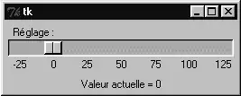 oscillo.py, nous complétons ce nouveau module par quelques lignes de code au niveau principal. Ces lignes permettent de tester le bon fonctionnement de la classe : elles ne s'exécutent que si on lance le module directement, comme une application à part entière. Veillez à utiliser vous-même cette technique dans vos propres modules, car elle constitue une bonne pratique de programmation : l'utilisateur de modules construits ainsi peut en effet (re)découvrir très aisément leur fonctionnalité (en les exécutant) et la manière de s'en servir (en analysant ces quelques lignes de code). Dans ces lignes de test, nous construisons une fenêtre principale root qui contient deux widgets : un widget de la nouvelle classeChoixVibra()et un widget de la classeLabel(). À la ligne 53, nous associons à la fenêtre principale un gestionnaire d'événement : tout événement du type spécifié déclenche désormais un appel de la fonctionafficherTout(). Cette fonction est donc notre gestionnaire d'événement spécialisé, qui est sollicité chaque fois qu'un événement de type <Maj-Ctrl-Z> est détecté par le système d'exploitation. Comme nous l'avons déjà expliqué plus haut, nous avons fait en sorte que de tels événements soient produits par les objets de la classeChoixVibra(), chaque fois que l'utilisateur modifie l'état de l'un ou l'autre des trois curseurs, ou celui de la case à cocher. Conçue seulement pour effectuer un test, la fonctionafficherTout()ne fait rien d'autre que provoquer l'affichage des valeurs des variables associées à chacun de nos quatre widgets, en (re)configurant l'option text d'un widget de classeLabel(). - Ligne 47, expression