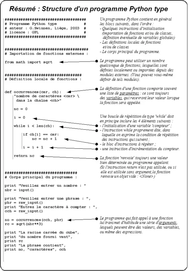 Notez bien que les trois parties du programme ont été disposées dans un certain ordre : d'abord la définition des fonctions, et ensuite le corps principal du programme. Cette disposition est nécessaire, parce que l'interpréteur exécute les lignes d'instructions du programme l'une après l'autre, dans l'ordre où elles apparaissent dans le code source. Dans le script, la définition des fonctions doit donc précéder leur utilisation.