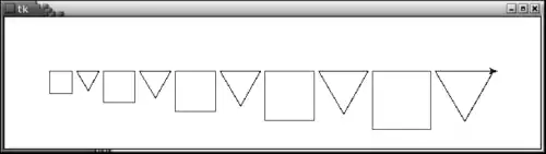 Commencez par ajouter un paramètreangleà la fonctioncarre(), de manière à ce que les carrés puissent être tracés dans différentes orientations. Définissez ensuite une fonctiontriangle(taille, couleur, angle)capable de dessiner un triangle équilatéral d'une taille, d'une couleur et d'une orientation bien déterminées.