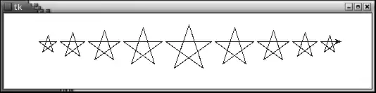 etoile5()spécialisée dans le dessin d'étoiles à 5 branches. Dans votre programme principal, insérez une boucle qui dessine une rangée horizontale de 9 petites étoiles de tailles variées :