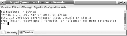 Les trois caractères « >>> » constituent le signal d'invite, ou prompt principal, lequel vous indique que Python est prêt à exécuter une commande. En mode interactif, ce que vous tapez est immédiatement exécuté. Mais le plus employé par les programmeurs est d'exécuter un script Python contenant plusieurs instructions, en lançant un fichier .py sauvegardé sur le disque dur.