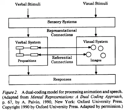 Le système verbal serait lié au langage et mémoriserait des informations comme les mots, leur orthographe, mais aussi leur sens. Il serait formé d'un réseau d'informations interconnectées entre elles. Le système visuel mémoriserait des images abstraites, qui permettent de reconnaître les objets connus, les visages des personnes connues, etc. Les connaissances des deux systèmes seraient reliées entre elles par des associations référentielles, qui permettent de relier les concepts concrets avec leur image. Par exemple, il existe une liaison référentielle entre le concept "chat" et l'image d'un chat.