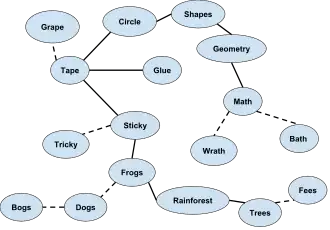 Mais dans le cas de la créativité, les associations formées relient des concepts lointains, éloignés dans le réseau sémantique, qui partagent peu de propriétés. Être créatif demande donc de passer outre les associations les plus évidentes, pour se concentrer sur des associations éloignées, rares, incongrues. Diverses études ont tenté de mesurer les connexions formées dans les tests de créativité simple. Et le résultat conforte l'intuition : les associations formées dans les tests de créativité relient des informations ou concepts éloignés.