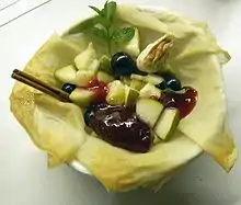 Badigeonner, au pinceau, chaque feuille de brick, sur les deux faces, avec un mélange eau et vinaigre (émulsion non stable = bien mélanger) ; placer les feuilles dans un ramequin pour leur donner une forme de corbeille, couper le pourtour de la feuille au ciseau pour en réduire le diamètre afin que les feuilles débordent un peu du ramequin. Placer ainsi le tout au four à 180 °C (thermostat 5) afin de faire dorer les feuilles (5 min). Pendant ce temps, monter le blanc en neige et incorporer le sirop de fruit, tout en continuant à monter la mousse de neige. À l’aide d’une petite cuillère, former des petites meringues sur un plateau allant au four et, enfourner le plateau, après avoir sorti les feuilles de brick du four. Une fois les meringues cuites, on peut remplir les corbeilles avec les fruits frais coupés en morceau et les petites meringues par dessus, décorer le plat avec des feuilles de menthe ou des traînées de coulis de fruits.