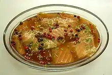 Ingrédients 1 filet de saumon (300 grammes), ½ verre de vinaigre ou 1 citron, 1 cuillère à soupe de baies roses, ciboulette ou estragon.