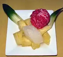 Vous pouvez proposer des fruits simplement présentés, mais vous pouvez aussi proposer des coupes de fruits avec des produits de saison, en salades de fruits variés sans apport de sucre, en mélangeant des fruits riches en eau (orange, pamplemousse, pêche, ananas par exemple) et des fruits plus fermes (pommes, poires, bananes..), le tout préparé avec un peu de jus de citron et présenté dans des petites coupes individuelles, de façon alléchante, en associant des couleurs vives, et un peu de décoration (une feuille de menthe, 1 cuillère à café de confiture, ou coulis de fruits rouges, faits « maison » à pauvre teneur en sucre, par exemple), vous pouvez aussi agrémenter les desserts composés de fruits avec des présentations originales comme dans quelques uns des exemples suivants.