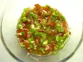 Ingrédients : 3 grosses tomates mûres, 50 g de pain rassis trempé dans un peu d’eau, 1 gousse d'ail, 1 verre à liqueur de vinaigre de vin, 1 œuf dur.