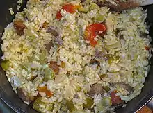 Faire cuire doucement les oignons émincés, les carottes coupées en touts petits dés ainsi que les légumes verts coupés en petits cubes. Ajouter le riz et mouiller avec 3 fois le volume d’eau ; faire cuire à feu doux pendant 35 min, en ajoutant de l’eau s’il le faut.