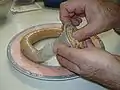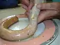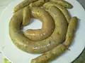 Méthode : hacher finement la viande crue, la mélanger ensuite avec les ingrédients adaptés, ne pas trop saler [H], et utiliser un entonnoir à bout assez large et long : faire glisser le boyau sur la partie rétrécie de l’entonnoir comme une longue chaussette plissée, nouer l’extrémité du boyau et avec la main et le pouce enfoncer la préparation de viande dans l’entonnoir pour remplir le boyau qui s’allongera progressivement, attention aux bulles d’air et à ne pas déchirer le boyau en forçant trop. (On peut aussi le fixer sur le hachoir avec un type de matériel adapté, ou en utilisant un poussoir à viande en vente dans les boutiques spécialisées).