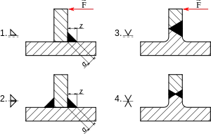 - soit la largeur du cordon de soudure z : elle indique l'encombrement, donc intervient lorsque le point important est le jeu, par exemple si le cordon est à proximité du chemin de roulement d'un galet.