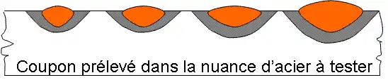 - La zone comprise entre la ligne de fusion et la ligne matérialisant la surface initiale de l'éprouvette de soudage correspondant à la zone de fusion du métal de base ; ,