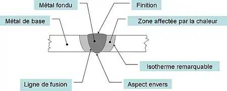 Dans ce qui suit, l'expression "joint soudé" est utilisée pour désigner à la fois le métal fondu, la ligne de fusion (FL), la zone thermiquement affectée et le métal de base.