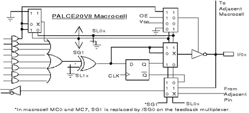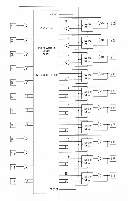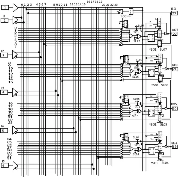 On distingue sur ce schéma une simplification sur les entrées du OU logique à l'aide de pointillés. Cela est dû au fait que le nombre de ET logique arrivant sur le OU logique est variable suivant la cellule configurable : les broches 14 et 23 ont en 8, les broches 15 et 22 ont en 10, les broches 21 et 16 ont en 12, les broches 17 et 20 ont en 14 et enfin les broches 18 et 19 ont en 16. Le nombre de multiplexeurs a franchement diminué (en taille comme en nombre) ce qui facilite sa compréhension.