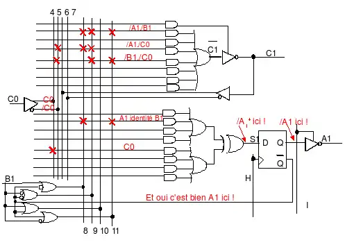 3°) (8)(9)=/A1, (9)(10) = A1 xor B1, (8).(11) = A1 identité B1, (9).(11)= /B1 (8)(9)(11)=/A1./B1,