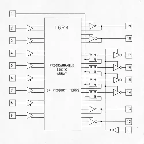 Appliquons tout ceci à la PAL 16R4 présentée ci-dessous :