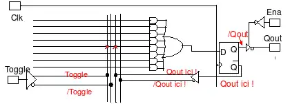 Mais le schéma de la 16R8 nous montre immédiatement que ce n'est pas Q+ qu'il nous faut réaliser mais /Q+ à cause de l'inverseur présent sur la sortie. Si est notre sortie, sera notre sortie de la bascule 16R8, et donc l'entrée D sera :