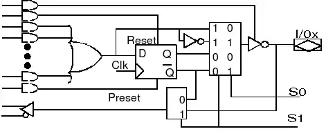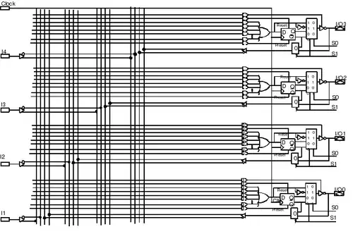 On peut y distinguer des multiplexeurs, commandés par les bits SG1 et SL0x (où x est le numéro de la sortie correspondante), un ou exclusif commandé par un bit SL1x. L'objectif de ce ou exclusif est de complémenter ou pas la sortie du ou logique qui le précède.