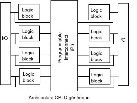 Tous les "Logic Blocs" sont à peu près équivalents à des PALs 22V10. Comme on peut le voir, ces PALs sont connectées par le bloc "Programmable Interconnect". Dans cette architecture une implantation ne nécessite pas de placements et routages mais seulement des interconnexions.