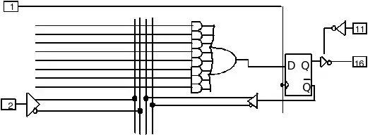 Remarque : La PAL étant une 16R8, le schéma ci-dessus est incomplet : il manque 7 sorties et aussi 28 fils verticaux (2 x 16 moins les 4 que l'on a).