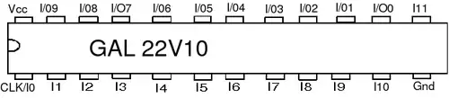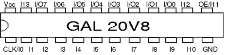 On présente ci-dessous le schéma partiel du circuit de la GAL 20V8 (24 broches dont 8 sorties configurables).