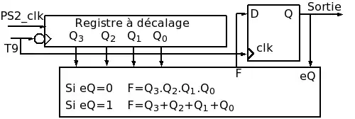 L'architecture peut être décrite comme suit : un registre à décalage 4 bits sensible aux fronts descendants de T9, une bascule D qui mémorise l'état de notre sortie et une partie combinatoire qui génère un 1 à l'entrée de la bascule D dès que le registre est rempli par 4 bits à 1 et que sortie vaut 0.