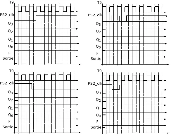 Remarque 1 : Il faut éviter une réalisation avec deux horloges différentes comme c'est le cas dans le schéma proposé ici. Pour votre information vous pouvez trouver un cours sur VHDL et particulièrement dans le chapitre Interfaces VGA et PS/2 la bonne façon de procéder. Cela ne change en rien les valeurs qui sont données ici.