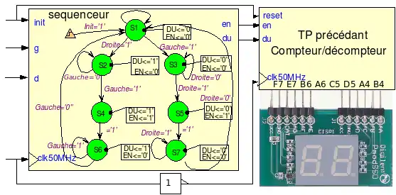 Remarque : on notera sur cette figure que l'horloge du séquenceur et l'horloge du chemin de données (compteur/décompteur) est la même, mais que ces deux parties sont sensibles à des fronts d'horloge différents (à cause de l'inverseur en bas). Cet inverseur peut être retiré, ce qui est d'ailleurs considéré comme une bonne pratique dans les FPGA, mais une mauvaise pratique si on le garde.
