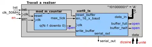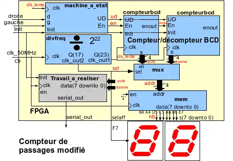 Nous allons donner un certain nombre d'indications pour une implantation complète dans un FPGA dans cette section. Les compteurs ne seront donc plus externes et devront être décrit et câblés en VHDL.
