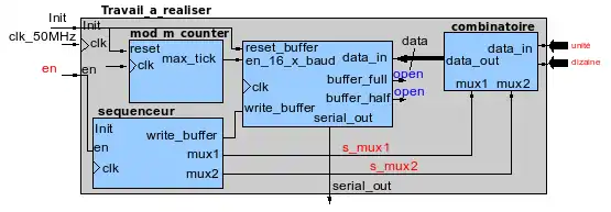 Il y a beaucoup de travail, mais si vous respectez les noms des signaux (en rouge) et les noms de chacune des entrées et sorties de chaque bloc, le travail se fait rapidement. Les deux compteurs du haut sont identiques et sont simplement les compteurs de l'exercice précédent de ce document.
