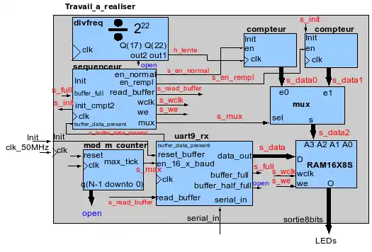 Un séquenceur sera responsable dès qu'il y a une donnée reçue ("buffer_full") de lire "data_out" et de l'écrire dans la mémoire puis d'incrémenter un compteur (d'adresses). Nous aurons en final deux compteurs : un pour lire le contenu de la mémoire et un pour écrire. Ils devront donc se partager le bus d'adresse, cela pourra se faire avec un multiplexeur dont l'entrée sera gérée par le séquenceur. Quand le séquenceur sera en train d'écrire dans la mémoire, il devra bloquer le compteur de lecture.