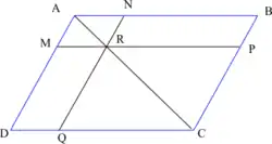 - On considère un parallélogramme (ABCD). Soit R un point de la diagonale [AC]. La parallèle à (AB) menée par R rencontre (AD) en M et (BC) en P. La parallèle à (AD) menée par R rencontre (AB) en N et (CD) en Q.