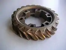 Ces roues ont des dentures très inclinées. On sait en effet que le meilleur rendement d'un système roue et vis sans fin est obtenu lorsque l'angle d'inclinaison d'hélice de la vis, égal à l'angle d'inclinaison de denture de la roue, vaut 45°-φ/2, φ étant l'angle de frottement. On a donc ici une inclinaison de denture de l'ordre de 43°.
