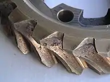 - L'usure abrasive proprement dite (abrasive wear) est due à la présence dans le lubrifiant de petites particules d'origine externe ou interne : débris d'usure par exemple. On remarque des rayures très fines, un aspect mat, un épaulement au fond de la denture et des dents érodées en lame de couteau. Le phénomène d'abrasion est souvent très rapide, il ne s'accompagne jamais d'adhésions locales ou de microsoudures et ne résulte pas d'un manque de lubrifiant. Ce dernier est au contraire le vecteur des particules abrasives. On assiste à la formation de dents pointues et souvent très affaiblies à la base. Dans de nombreux cas, les dents finissent par se rompre ou, si elles sont traitées, par subir d'autres formes d'usure fatales comme l'écaillage étudié plus loin.