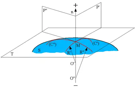 Tout plan normal (P) coupe la surface (S) selon une section normale (C) dont on peut définir le centre de courbure O et le rayon de courbure au point M.
