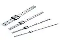 Ces guidages sont précontraints afin d'obtenir des déplacements répétables, sans à-coups, tout en minimisant le jeu. Les cages qui maintiennent les rouleaux cylindriques sont disposées à 90 ° en alternance afin d'assurer la permanence du contact avec les chemins de roulement durcis.