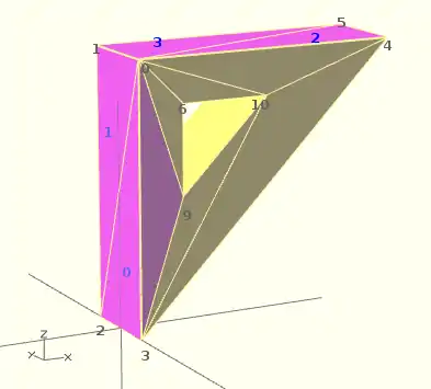 If you don't really understand "orientation", try to identify the mis-oriented pink faces and then permute the references to the points vectors until you get it right. E.g. in the above example, the third triangle ([0,4,5]) was wrong and we fixed it as [4,0,5]. In addition, you may select "Show Edges" from the "View Menu", print a screen capture and number both the points and the faces. In our example, the points are annotated in black and the faces in blue. Turn the object around and make a second copy from the back if needed. This way you can keep track.