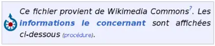 La façon la plus simple de trouver des images en rapport avec un sujet qui vous intéresse est de consulter l’article sur Wikipédia consacré à ce sujet. Les articles généralistes contiennent souvent quelques images ; cliquez dessus afin d’afficher leur page de description. Vous obtenez le plus souvent un message vous indiquant que le fichier est hébergé sur Wikimedia Commons, souvent appelé simplement Commons.
