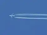 | Traînée de condensation | Pas un genre de l'OMM mais un type de Genitus[34]. Long et fin nuage formé après le passage d'un avion à haute altitude (appelé contrail en anglais). Il peut persister de quelques minutes à plusieurs heures selon la stabilité et l'humidité relative à la hauteur de production[35] | Cirrus homogenitus | ![]() |