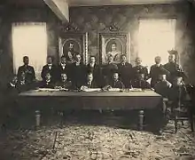 - 4 mars-10 avril : accords anglo-franco-russes de Petrograd. Les représentants de la Triple-Entente s’entendent sur le démantèlement de l’Empire ottoman en cas de victoire des Alliés[44]. La Russie réclame la pleine possession de Constantinople et des Détroits, ainsi que la Thrace orientale. Elle accepte en retour les visées britanniques sur la Mésopotamie et le Golfe et la question Perse serait réétudiée de manière plus favorable. La France demande la Cilicie et la Syrie, mais la Russie refuse de voir les Lieux Saints passer sous contrôle français et préconise un régime international.
