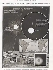 - 29 mai : lors d'une éclipse totale de soleil sur l'Île de Principe, l'expédition dirigée par l'astronome et physicien britannique Arthur Eddington mesure une déflexion de la lumière des étoiles par le soleil, exactement conforme aux prédictions de la relativité générale, c'est-à-dire la déviation gravitationnelle de la lumière (décalage d'Einstein)[8]. La preuve de la relativité générale est présentée le 6 novembre à Londres, dans la Burlington House, lors d'une séance présidée par Sir Joseph John Thomson, Prix Nobel de physique en 1906[9].