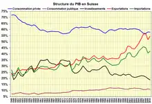 En 2009, la consommation privée représentait 57,9 % du PIB, la consommation publique 11,4 % et les investissements 20,6 %. La Suisse se distingue par un taux de consommation publique particulièrement faible parmi les pays de l’OCDE. Le taux d’investissement est le plus bas que la Suisse ait enregistré en cinquante ans, même s’il reste plus élevé que ceux de tous les autres pays du G8. Ce phénomène n’est pas lié à une politique de désinvestissement mais par l’énorme excédent que les échanges commerciaux engendrent : les exportations se chiffrant à 50,4 % et les importations à 40,2 %, soit plus de 10 % du PIB[23].