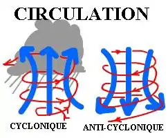 Le sens de rotation des vents autour du centre de l'anticyclone est lié à la force de Coriolis : dans le sens horaire dans l'hémisphère nord et dans le sens anti-horaire dans l'hémisphère sud. C'est ce qui définit également la circulation anticyclonique[2]. La formation d'un anticyclone se nomme anticyclogénèse[3] et sa dissipation anticyclolyse[4].