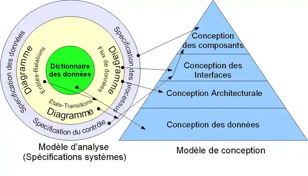 La pyramide exprime que chaque couche est bâtie sur la précédente. En effet, les composants réalisant les fonctionnalités du logiciel doivent manipuler des éléments de données qui doivent donc être préalablement décrits. De même, les composants réalisant les interfaces utilisateurs doivent utiliser les fonctionnalités du logiciel préalablement décrites. Et finalement, la création de l'architecture détaillée de chacun des composants du logiciel nécessite, évidemment, que ceux-ci soient préalablement inventés.