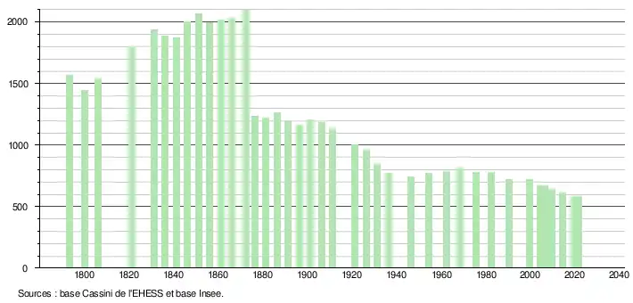 L'évolution du nombre d'habitants est connue à travers les recensements de la population effectués dans la commune depuis 1793. Pour les communes de moins de 10 000 habitants, une enquête de recensement portant sur toute la population est réalisée tous les cinq ans, les populations légales des années intermédiaires étant quant à elles estimées par interpolation ou extrapolation[28]. Pour la commune, le premier recensement exhaustif entrant dans le cadre du nouveau dispositif a été réalisé en 2004[29].
