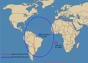 Le lieu des points, d'où l'on relève un astre donné à un instant donné à une certaine hauteur au-dessus de l'horizon, dessine un cercle sur la sphère terrestre. Le centre de ce cercle correspond à la position à laquelle cet astre est au zénith. On connaît avec exactitude (par les éphémérides) la latitude et la longitude de cette position[4], aussi appelé "pied" de l'astre ou point substellaire. Le rayon du cercle est le produit du rayon de la Terre et de la distance zénithale de l'astre[réf. souhaitée], où , étant la hauteur de l'astre au-dessus de l'horizon.